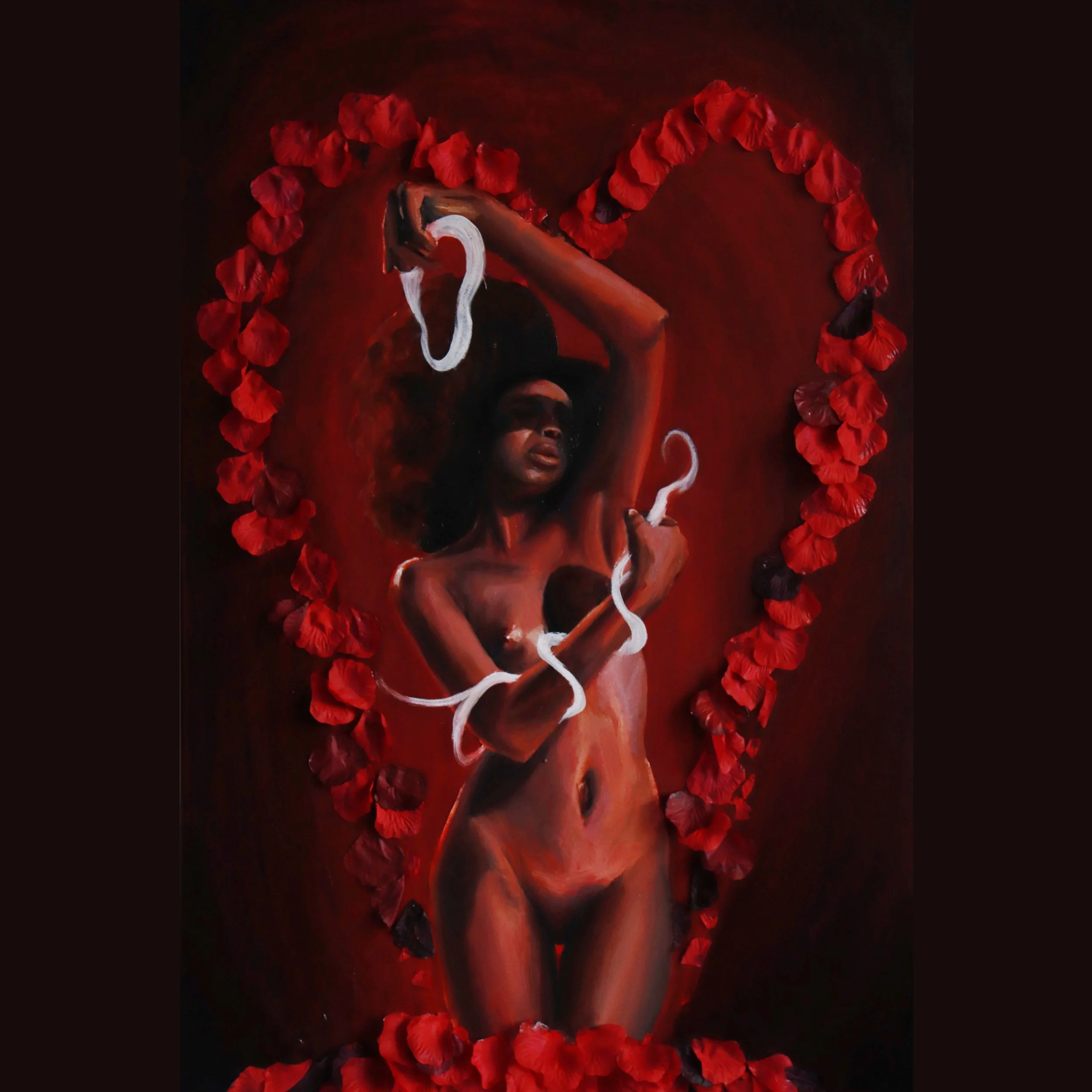 Secured-Affirmation" invites us into a sacred dialogue with the self, capturing the delicate balance between vulnerability and empowerment. The painting radiates a quiet intimacy, reflecting the courage it takes to confront and embrace one's inner truths. The contrast of textures between the rose petals and the smooth oil paint, mirrors the duality of strength and gentleness required to nurture self-love. This painting is a reminder that we are our own sanctuary, capable of offering ourselves the deepest acceptance and care. Through this visualized energy we must carry and nurture the transformative power of seeing oneself fully, affirming that the love we give inwardly is not only essential but irreplaceable.
