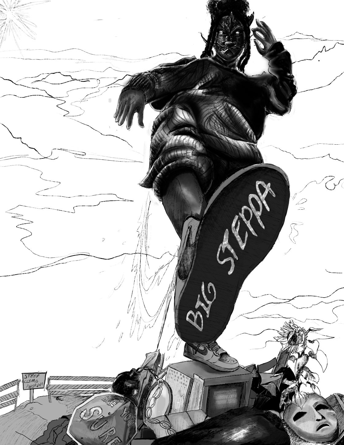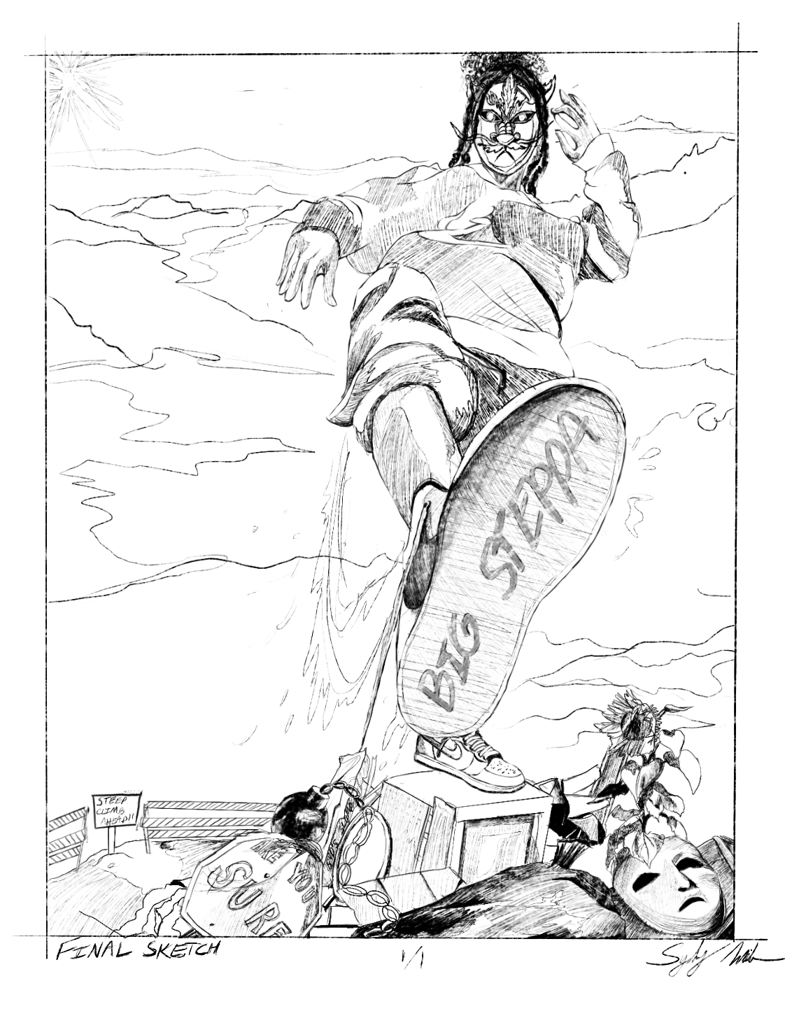 “Big Steppa” was a personal piece I started at the beginning of 2022, and used as a symbolic drawing to represent that year and years to come. It represents overcoming obstacles mentally and literally that I may face in life, and to keep climbing. The phrase “Big Steppa” comes from just making big leaps in my art and myself as a person.